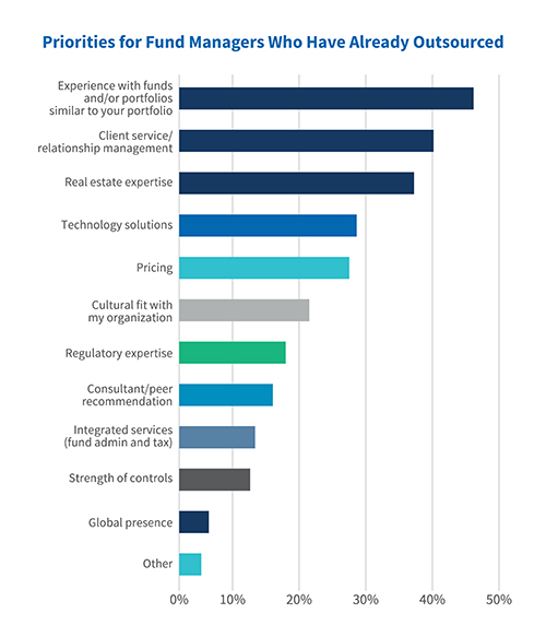 That’s reassuring for fund managers who fear they might lose control by turning functions over to a third party. As the survey showed, real estate expertise (45 percent) and technology solutions and capabilities (41 percent) ranked among the top priorities for those who have yet to outsource.